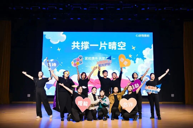 会上,青浦区学生心理发展辅导中心志愿者们倾情演绎《共撑一片晴空》,以老师、家长和学生互换身份的形式,呈现了相互之间的爱与支持,引发现场共鸣。