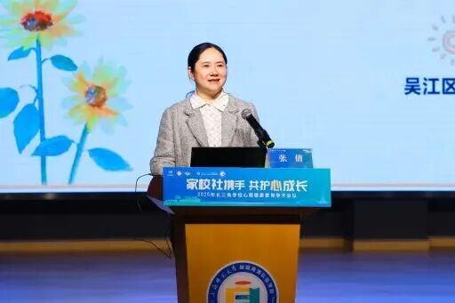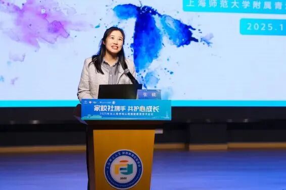 青浦区教育工作党委委员、教育局副局长张晓静致辞,她介绍了青浦区通过联动高校实现课程与科研融合、推进医教结合提升专业服务水平、联动群团组织及街镇凝聚社会合力等有效做法,并提出愿景:将以本次会议为新起点,深化心理健康教育改革创新,推动重点项目落地见效,健全协同育人网络,提升教育实效性;呼吁家校社同心同向,呵护学生心理健康,为培养时代新人奠定心理健康教育基础。