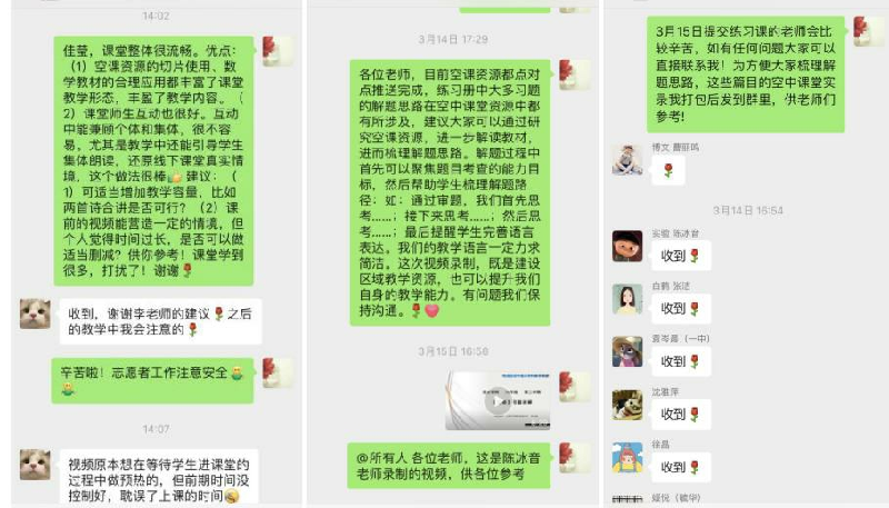两位老师还积极参与线上巡课,通过“云听课”了解一线教师线上教学教研需求,并以“个别反馈”和“集体反馈”的方式帮助教师梳理提炼优秀经验;组织骨干教师梳理开发优质教学资源,通过教学示范、练习讲评微视频、教学妙招推文、作业案例等方式引导老师们互学互鉴,为老师们线上教学提供支持。