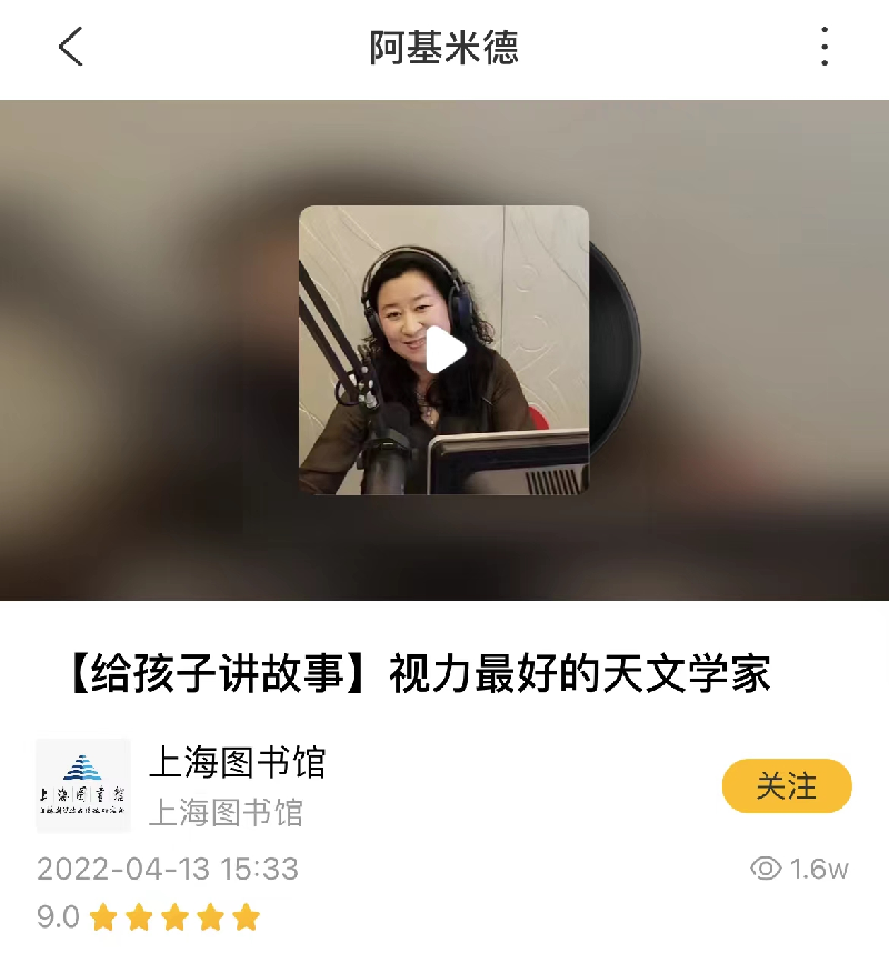 疫情时期,广大市民,尤其是孩子们,承受了很大的心理压力。为此,上海图书馆联合上海人民广播电台、阿基米德推出了“蛤蜊讲故事”活动,为疫情影响下的孩子们讲故事,用声音把故事中的知识和美好传递给孩子们。王继红老师在居家办公之余,也投入到了这场以声音聚集的志愿者行列中。她精心准备素材,挑选适合孩子们的科学故事,反复试讲录制,并自学声音编辑软件AU,进行编辑、配乐以及降噪等处理。目前,王老师已录制完成了《视力最好的天文学家》、《称象与洗澡》、《斜塔实验》等儿童科学故事,这些故事在阿基米德平台上已有3万人次的收听量,受到了孩子们的喜爱。隔离不隔爱,王老师以声音传递知识、传递美好、传递爱与力量。