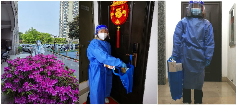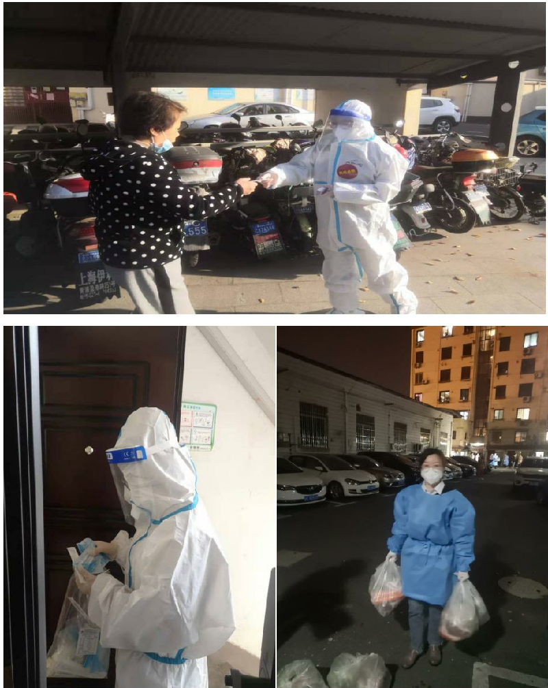 他们一家四口,除了一个未成年的儿童,其他三个成年人第一时间投入到疫情防控工作中。三月中下旬,董菊美老师作为社区党员志愿者,承担起了PDA扫码的任务。三月中旬,董老师的儿子奔赴徐泾抗疫一线,参加守村志愿者工作,一直到封控开始,更是投入到防疫一线,参与物资保障、消杀等工作,一度还被派到方舱医院物资保障组。4月1日封控开始,董老师的老公也投入到夏阳街道的社区防疫工作。由于防疫工作要求,她老公和儿子必须住在工作地,此时的董老师除了完成在线巡课和其他工作以外,还要承担起照顾家里唯一一个未成年人的任务,虽然她没办法一整天参与志愿者工作,但是她还是挤出时间帮助楼组长统计群里反馈信息和发放防疫物资的工作。