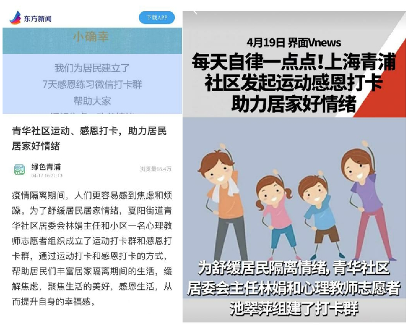疫情隔离期间,人们更容易感到焦虑和烦躁。为了舒缓居民居家情绪,德研室池翠萍老师与青华居委会林娟主任一起,在社区发起了运动打卡群和感恩打卡群。通过运动打卡和感恩打卡的方式,帮助居民们丰富居家隔离期间的生活,缓解焦虑,聚焦生活的美好,感恩生活,从而提升自身的幸福感。绿色青浦、夏阳视点、东方新闻等多个官方媒体报道了运动、感恩抗疫活动。