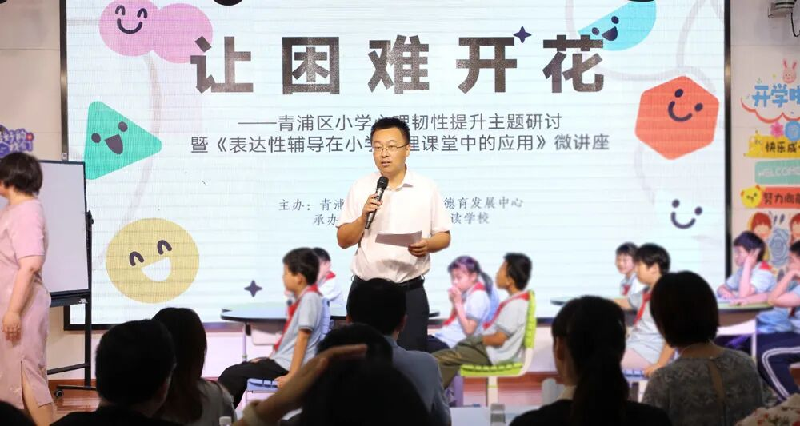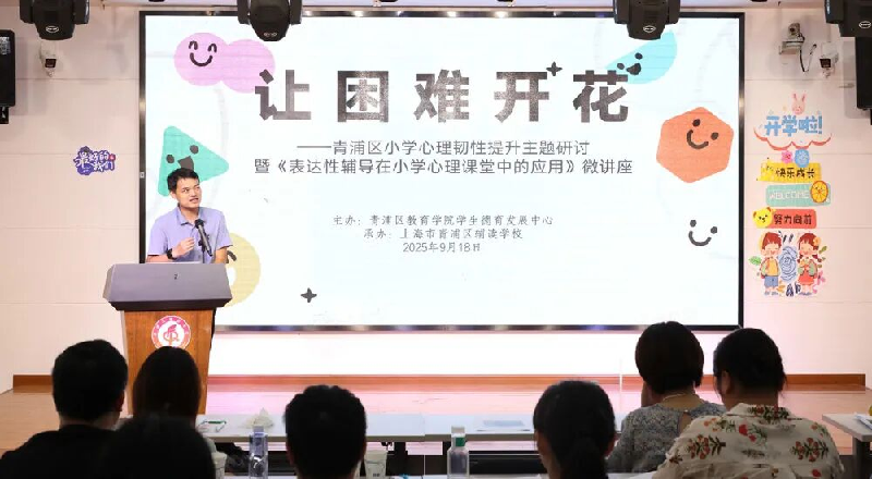 2025年9月18日下午,由青浦区教育学院学生德育发展中心主办、上海市青浦区辅读学校承办的“让困难开出花——小学心理韧性提升”主题研讨暨“表达性辅导在小学心理课堂中的应用”微讲座在辅读学校顺利开展。青浦区全体小学心理教师、青浦区辅读学校相关领导和教师共同参与本次活动,活动由青浦区教育学院小学心理德研员池翠萍主持。