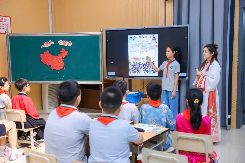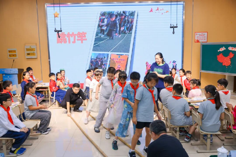 活动伊始,由徐泾二小班主任陈丽丽执教《一家人 心连心》主题班会,通过情景模拟、竹竿舞等实践体验,筑牢学生“中华民族共同体”意识,引导其以实际行动践行民族团结。