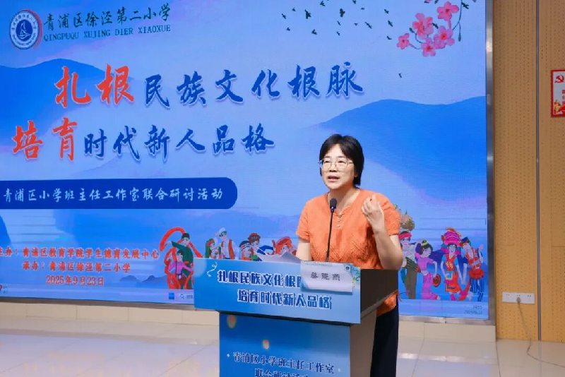 9月23日下午,由青浦区教育学院学生德育发展中心主办、徐泾第二小学承办的“扎根民族文化根脉,培育时代新人品格”青浦区小学班主任工作室联合研讨活动在徐泾二小西部校区举行。会议由青浦区教育学院班主任德研员卓月琴主持,宝山区教育学院班主任德研员曹蓉、松江区教育学院班主任德研员蔡晓燕、徐泾第二小学党支部书记、校长徐晓新、副校长张薇、以及全区各班主任工作室成员及徐泾第二小学凌霄班主任工作室成员近40余人参与本次活动。