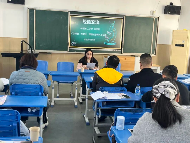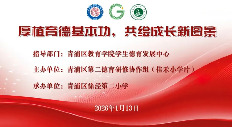 2026年1月13日下午,2025学年青浦区德育研修协作二组专题研修活动在徐泾第二小学举行。本次活动紧扣立德树人根本任务与班主任队伍建设核心要求,以“厚植育德基本功 共绘成长新图景”为主题,通过文化浸润、课堂展示、经验分享、互动点评等多元形式,为班主任搭建专业化成长平台,共探德育实践新路径。参加活动的有青浦教育学院德研员池翠萍、许晨曦,青浦区徐泾第二小学党支部书记、校长徐晓新,原徐泾第二小学常务副校长、现关工委委员赵志方、协作组各成员校德育分管领导、班主任代表及徐泾二小凌霄班主任工作室全体成员共计六十余人,活动由青浦区徐泾第二小学德育处主任韩洋主持。
