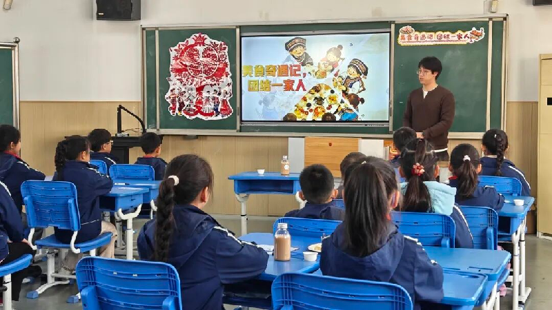 微主题班会环节,徐泾二小蔡凌轩老师带来题为《美食奇遇记 团圆一家人》的主题班会。课堂以民族美食为纽带,构建“分享文化渊源—探究习俗关联—践行尊重包容”的育人链条。学生们分组分享各民族传统美食背后的劳动智慧,通过情境探究明晰饮食文化与地理环境、生活习俗的深层联系。蔡老师以学生饮食习俗争议为切入点,引导学生展开思辨讨论,传递“尊重差异”的价值理念。最后,学生们将写下感悟的“同心卡”贴在班级“石榴树”上,以生动实践呼应“56个民族像石榴籽一样紧紧抱在一起”的家国情怀,让文化传承与价值引领在趣味课堂中自然落地。