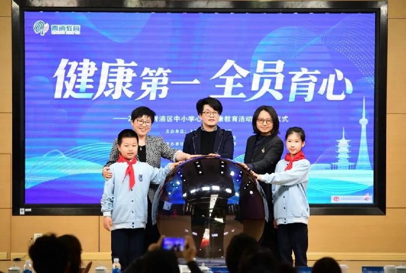 张晓静、周敏华、片区关工组负责人潘菊萍老师与学生代表共同上台,正式启动2026年青浦区中小学心理健康教育活动季。