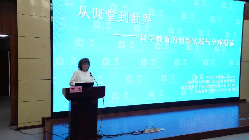 上海师范大学王洁博士以《从课堂到世界:科学教育的创新实践与全球借鉴》为题给老师们作了一场精彩的学术报告。王老师分析了一些教育实例和PISA全球学生测试结果,提出科学教育的真正目的是让孩子们面对世界上的难题时,知道怎么看、能判断、敢行动。这就要求老师在课堂教学中不只是“讲知识”,而是“培养看世界的方式”,培养学生“我能做什么”。她建议可以通过跨学科理解、项目化课程设计、教练型教学法、微课题与校本教研等方式改进教学,和学生一起探索,让孩子们懂得世界的变化,有能力、有信心去参与、去解决人类社会的难题,让他们真正成为“人类的孩子”。