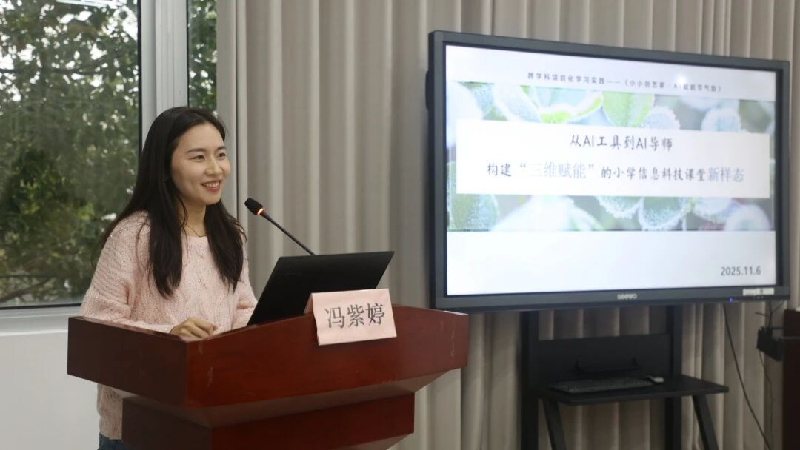瀚文小学冯紫婷老师分享《从“AI工具”到“AI导师”:构建“三维赋能”的小学信息科技课堂新样态》,提出AI大模型的角色应从单纯“工具”向“导师”转变,从知识、能力、思维三个维度赋能课堂,并结合教学实例展示“三维赋能”课堂样态,引发热烈讨论。