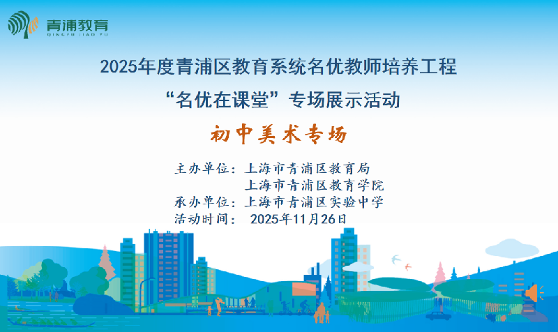 2025年11月26日下午,青浦区教育系统名优教师培养工程"名优在课堂"美术专场活动在青浦区实验中学举行。嘉善县美术教师代表、青浦区中小学美术名优教师、美术学科教师代表、心理和思政学科名优骨干教师、青浦区教育学院课程与教学研修中心副主任李慧慧等相关教师参加活动。活动由初中美术名优教师、上海政法学院附属青浦崧淀中学齐红岩老师主持。