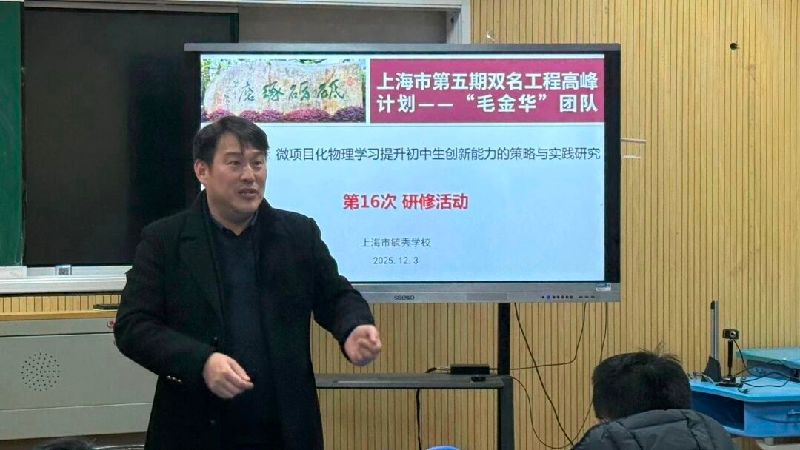2025年12月3日,上海市第五期双名工程“高峰计划”毛金华团队专题研修活动在上海市毓秀学校顺利举行。活动特邀物理特级教师耿海成、青浦区物理教研员倪忠新莅临指导。团队全体成员及区内部分物理教师参与了现场研讨;援疆、援滇的俞君萍老师、王淑娟老师及所在地区的部分初中物理教师参与了线上观摩。