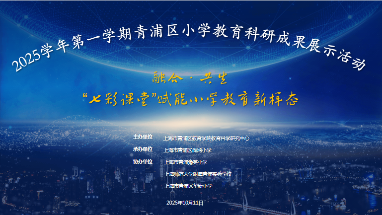 10月11日,由上海市青浦区教育学院教育科学研究中心主办,青浦区尚鸿小学承办,青浦豫英小学、上海师范大学附属青浦实验学校、青浦区华新小学协办的融合·共生:“七彩课堂”赋能小学教育新样态——2025学年第一学期青浦区小学教育科研成果展示活动在尚鸿小学顺利举行。