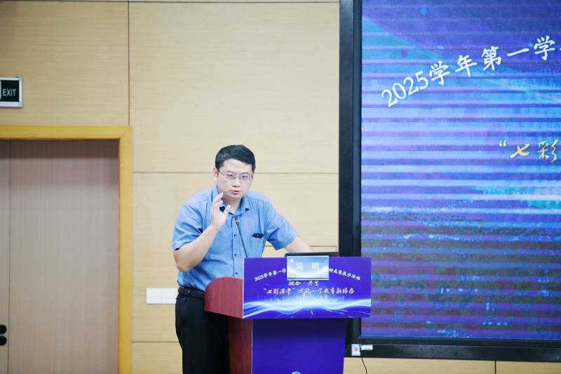 冯明主任作专家讲座。他首先高度肯定了青浦区在科研成果推广与课堂实践融合方面的探索,指出“七彩课堂”与“学练赛评”一体化实践体现了科研驱动的课堂变革特质:理念引领、系统设计、技术融合、学习进阶。在讲座中,他强调了具有教育科研味道的课堂教学研究应立足学生真实成长,关注思维培养、注重实践体验、大胆拥抱技术、系统设计学习,提供精熟的问题解决方案,持续构建“活”的教育生态。