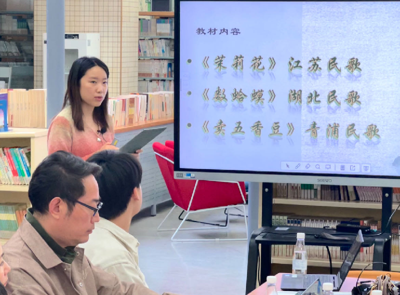 青浦区思源中学张颖颖老师通过说课的方式对单元第三课时展开教学。通过欣赏、模唱《茉莉花》,让学生深刻感受到小调曲调委婉、结构完整这一音乐特点,拓展欣赏《数蛤蟆》《卖五香豆》让学生了解小调丰富的题材。与此同时,考虑到这一课时作为单元最后一课教学,张老师借单元总结输出性活动带领学生梳理总结了三种民歌体裁不同的音乐特性与风格特征 ,充分体现了单元教学的结构化、逻辑性思考。