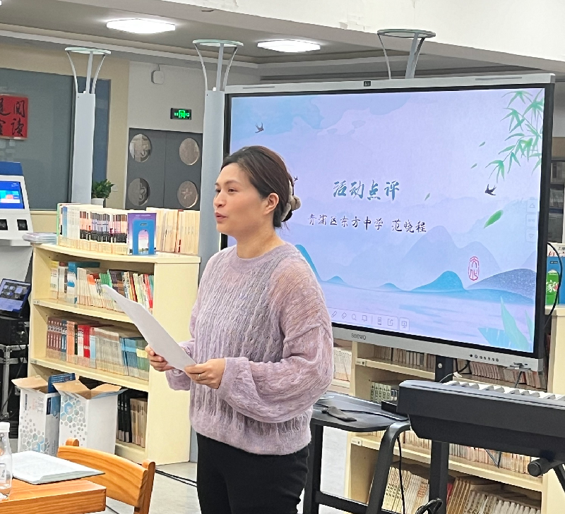 接着由初中联片教研组长东方中学范晓程老师对潘俞典老师的实践课例进行点评。她从课堂导入有效激发兴趣、学习活动的有效组织、评价用语的多元性以及教师生动的教态等方面进行交流点评。