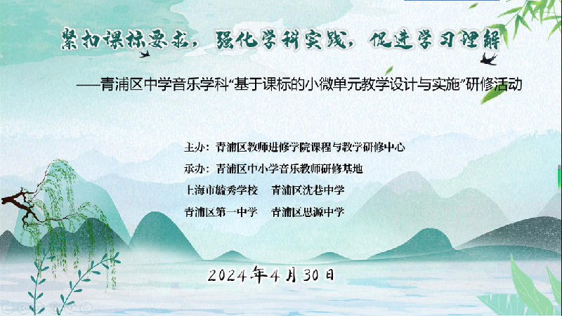 2024年4月30日下午,青浦区初中音乐“紧扣课标要求 强化学科实践 促进学习理解--基于课标的小微单元教学设计与实施“主题研修活动在上海市毓秀学校顺利举行。本次活动由区学科中心组成员、教师研修基地副主持人上海市博文学校周依青老师主持,全区中学音乐老师共同参与。