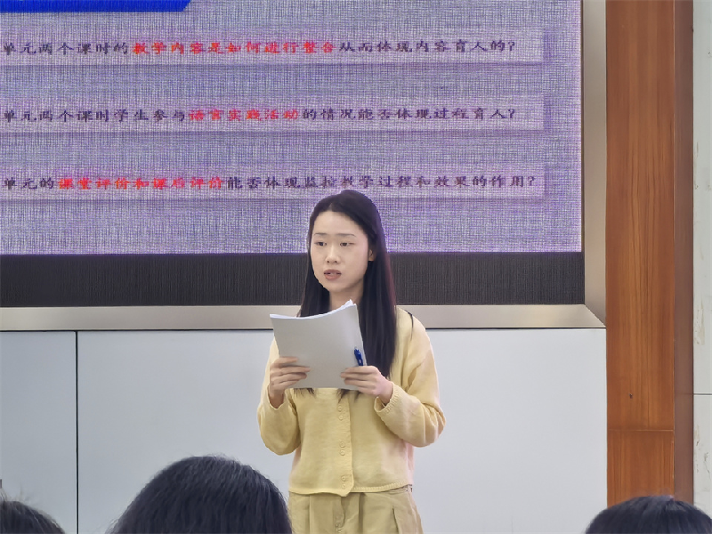 在此之后,张敏稚老师就本次活动的课堂教学做简要点评。张老师就教学设计与实施提出了三点关注:一是研读语篇,创设真实情境,整合教学内容;二是任务驱动,解决真实问题,实施学习活动;三是以评促学,教学评一体化,知识转化能力。