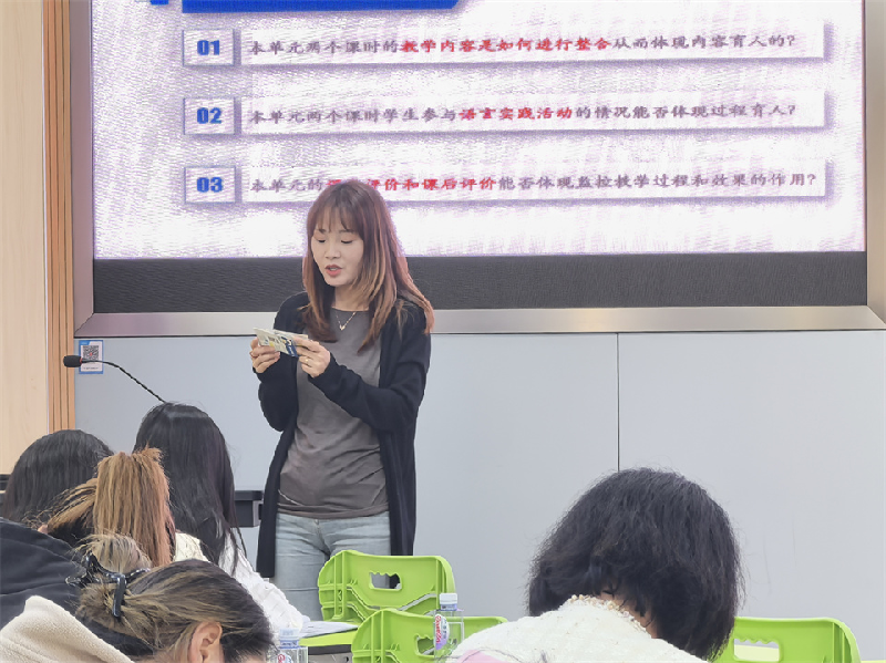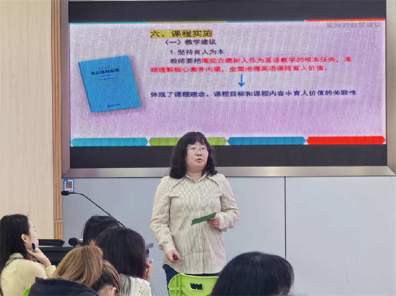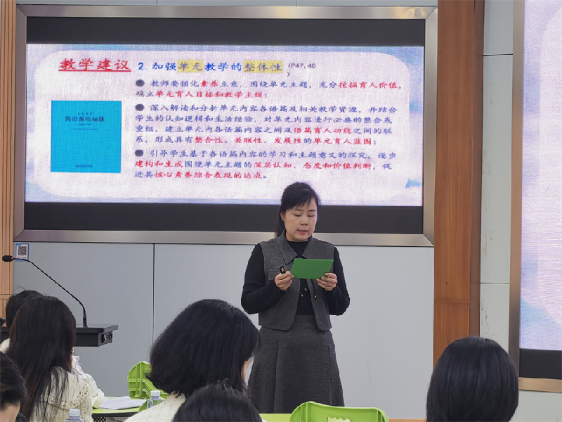 在第三阶段,全体参会老师聆听了由唯实小学沈佩芳老师、白鹤小学陈玲老师和赵屯小学张静静老师所做的《义务教育英语课程标准(2022年版)》导读。本次导读聚焦第六章课程实施第一节教学建议中的第一至第三条:坚持育人为本;加强单元教学的整体性;深入开展语篇研读。