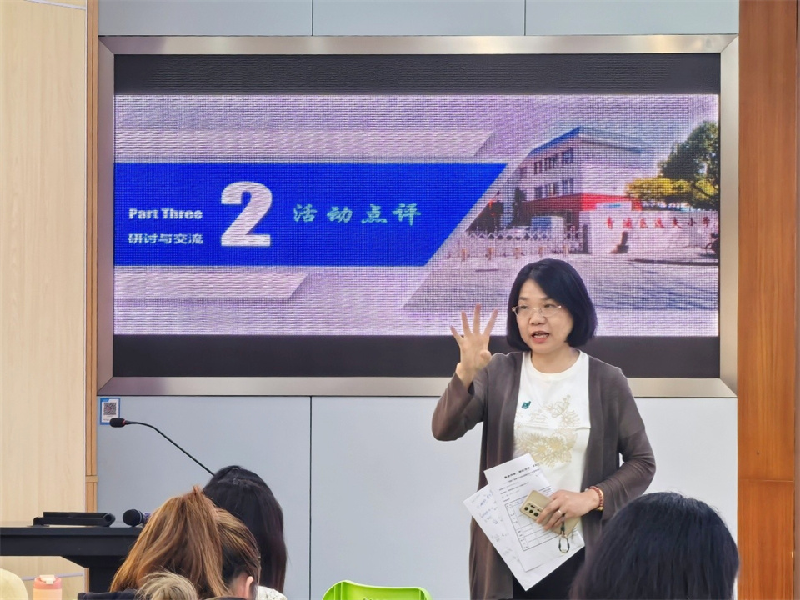 最后,青浦区教育学院课程与教学研修中心副主任周根妹老师进行了活动总评。周老师十分欣赏两位执教教师不同的教学特色,肯定了两位老师对学生语言能力及素养的培育。同时,周老师就“由教向学的变革”要求教师了解与研究学生的发展规律、学习特征及个体差异,并提出三点建议:一是在教学内容整合方面,研究从书本知识走向真实世界;二是在学习活动优化方面,转变从教师灌输走向学生探究;三是学生素养培育方面,改变从只“听”走向“做”的学习方式。