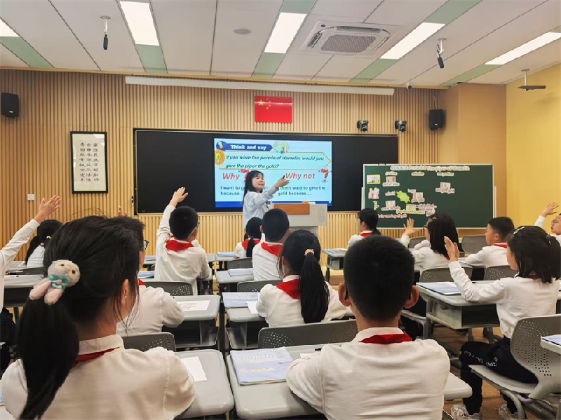 随后,青浦兰生学校张晓宇老师进行了4BM4U1第一课时 The piper of Hamelin的课堂教学展示。课堂上,张老师能基于语篇设计与实施环环相扣的问题链,形成学生理解故事内容的结构化知识;张老师通过身份转换,引导学生扮演角色体验故事中人物的情感、语言和行为变化,深入理解故事语篇蕴含的意义和哲理。同时,张老师能围绕单元主题创设文化语境,引领学生在故事学习过程中感受和体悟管笛人吹奏管笛解决问题的能力以及管笛音乐的特点和魅力,单元主题意义The music is powerful的育人价值得以体现。