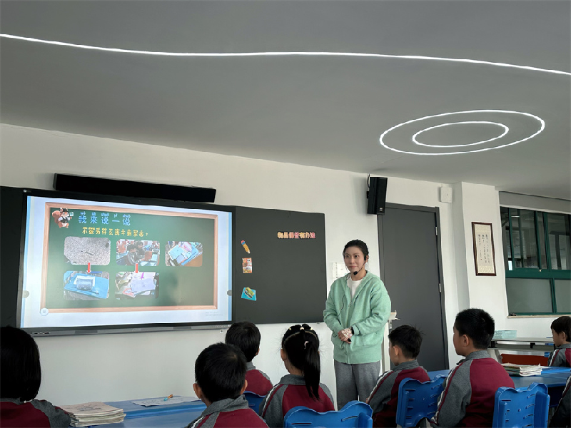 随后,青浦区崧泽学校章佳文老师面向一年级学生开展《物品保管有办法》教学。课程承接幼儿园物品管理基础,结合小学生活需求,以 “小张求助” 情境导入,通过 “小侦探分析丢失原因” 归纳物品整理方法;再以 “整理课本”、“协作收纳书包” 实操巩固技能,推动物品管理从 “技能掌握” 升级为 “责任意识养成”,助力学生适应小学规范生活。两节课循序渐进、各有侧重,呈现了幼小衔接阶段物品管理能力培养的进阶路径。