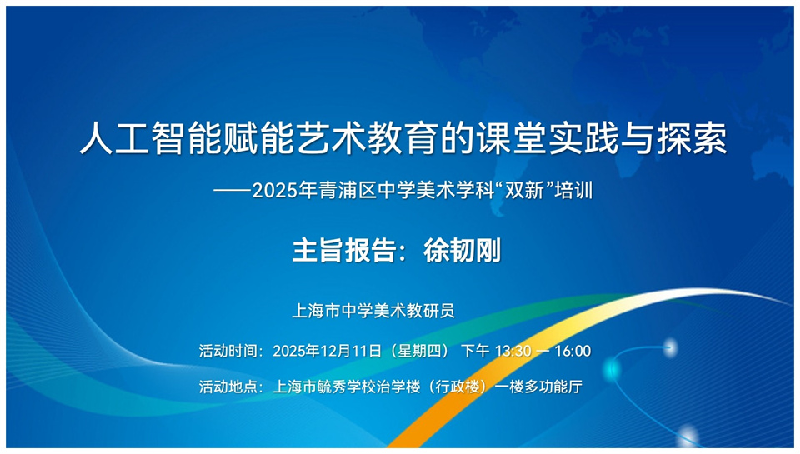 2025年12月11日下午,以“人工智能赋能艺术教育课堂实践与探索”为主题的青浦区中学艺术学科“双新”专题培训在上海市毓秀学校举行。上海市中学艺术、高中美术教研员徐韧刚,上海市特级校长、毓秀学校校长周秀芳,青浦区中学艺术教研员刘怀芹、裴永飞以及全区初、高中美术、音乐学科教师130余人参与了本次活动。活动由刘怀芹老师主持。