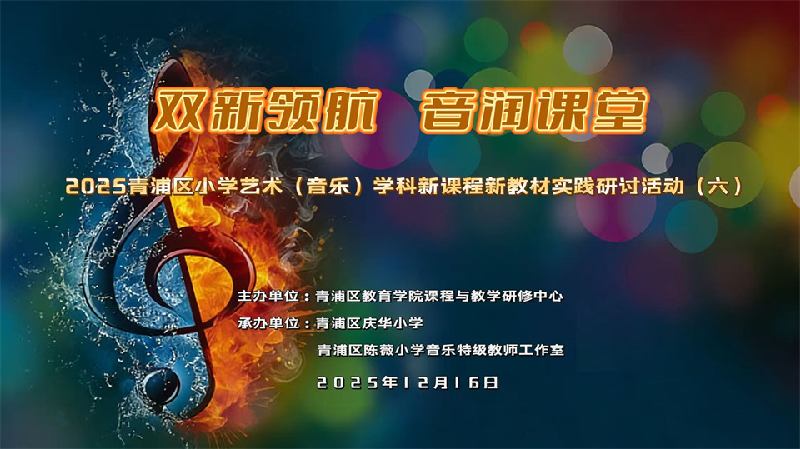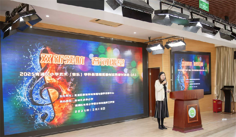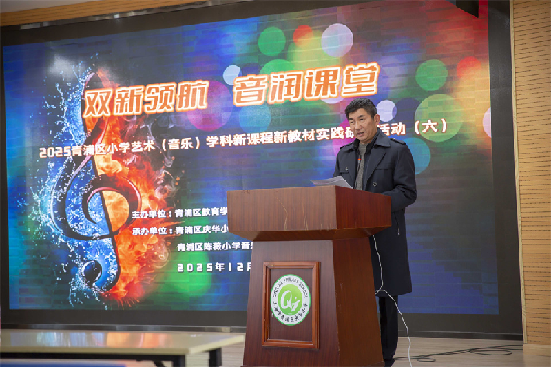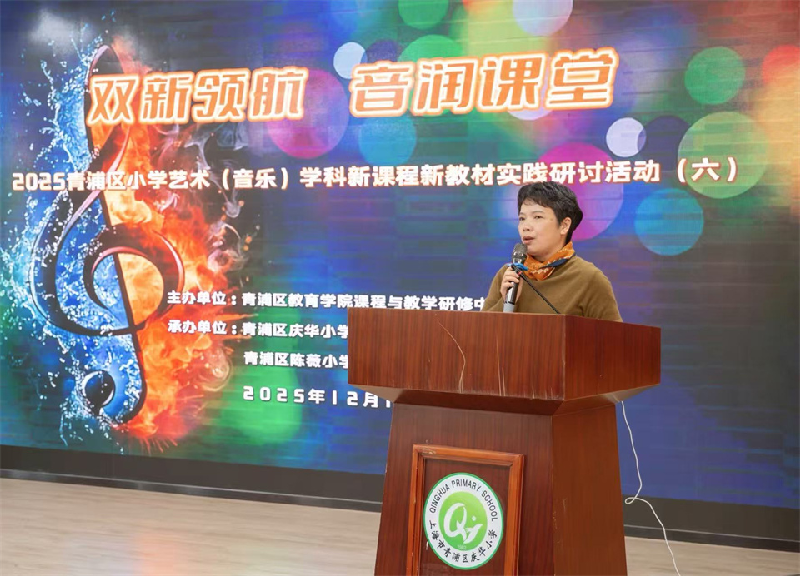 12月16日下午,“双新领航 音润课堂——青浦区小学艺术(音乐)学科新课程新教材实践研讨活动(六)”在青浦区庆华小学举行。上海市特级、正高级教师曹晏平,苏州市吴江区、本市嘉定区以及本区小学音乐教师代表70余人参与活动。活动由崧文小学赵予愉主持。