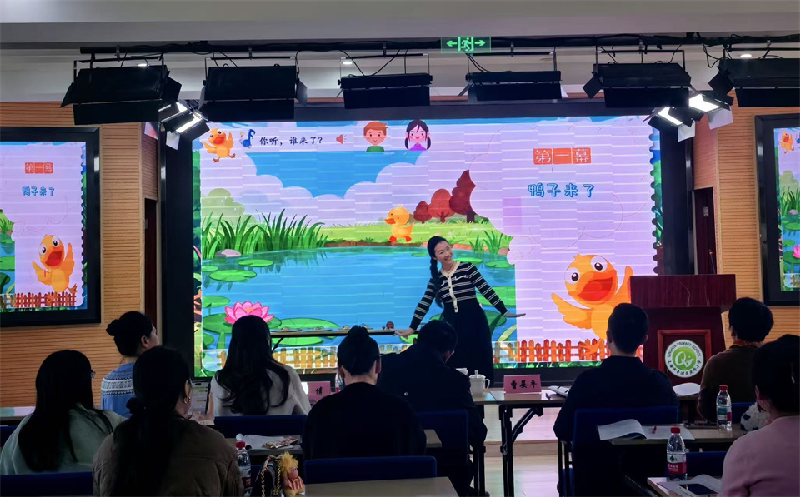 青年教师陶仁丹模拟呈现二年级欣赏《鸭子拌嘴》,借助动作、节奏编创及声部叠加等,让学生“玩懂”民族打击乐器的音色密码。