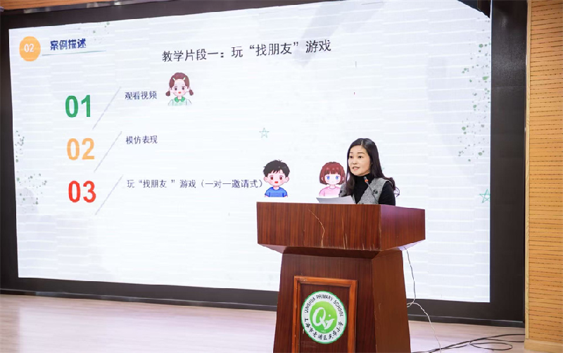教研组长严叶以《找朋友》为例,从情境化游戏、结构化认知、生活化编创三方面,分享“以‘游’促学、以‘唱’育情”的教学策略。
