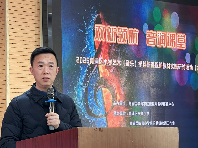 上海市特级校长、正高级教师、庆华小学校长吴根华致欢迎辞。他表示“双新”是育人理念与教学方式的系统升级,学校将持续打造“向美而行”的校园文化,为区域音乐教育注入新动能。
