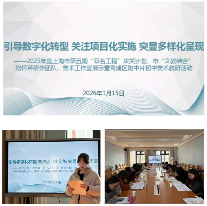 2026年1月15日下午,上海市第五期“双名工程”攻关计划、市“文教结合”刘怀芹研修团队、美术工作室展示暨青浦区附中片初中美术教研活动在青浦区教育学院附属中学成功举办。活动由清河湾中学吴颉依老师主持,上海市教委教研室小学美术教研员徐敏、区中学美术教研员刘怀芹等专家现场指导,青浦区及跨区多所中小学美术教师代表共同参与。